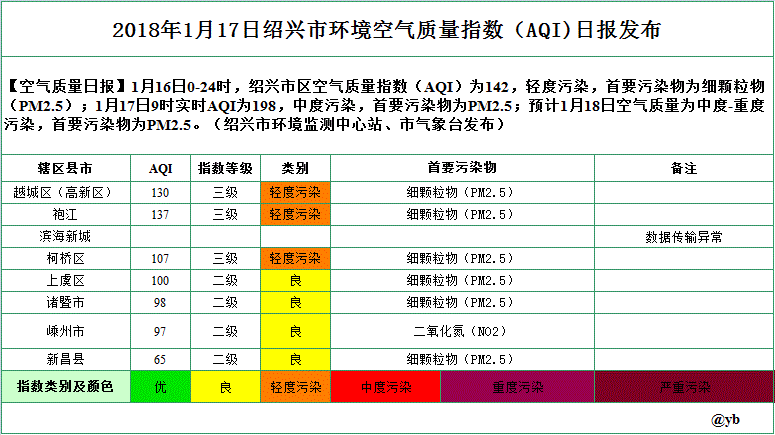 2018年1月17日绍兴市环境空气质量指数(AQI)日报发布
