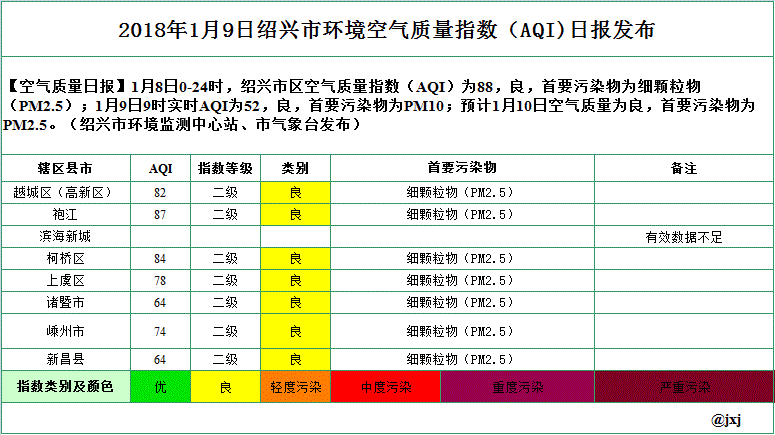2018年1月9日绍兴市环境空气质量指数(AQI)日报发布
